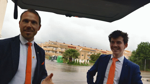Three Inmoplayaflamenca real estate agents in suits and orange ties, smiling and laughing outdoors.