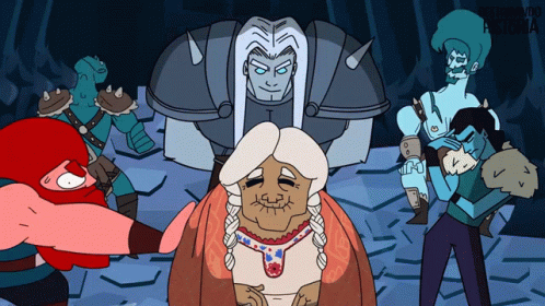 Cartoon characters from Destripando La Historia, including Thor and an old lady, in an 'immovable' scene.