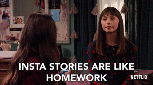 Molly from No Good Nick expresses her frustration, saying 'Insta Stories Are Like Homework' while talking to a friend.