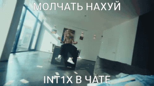 Int1x (Тагир) in chat, telling people to shut up, sitting shirtless in a modern room.