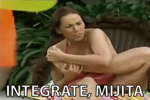 Federica Peluche (Consuelo Duval) in a bikini, in a memorable scene from La Familia P. Luche, with the caption 'Integrate, Mijita'.