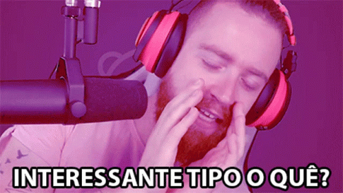 Lubatv, wearing headphones, asks 'Interessante Tipo O QuĂȘ?' with an expressive gesture into his microphone.