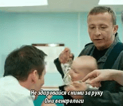 A man holding a baby humorously warns another man not to shake hands with venereologists, from the show Interny.