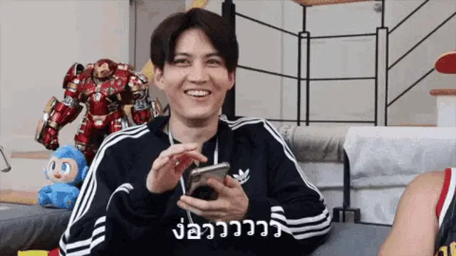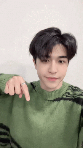 INTO1尹浩宇 (Patrick) waves to the camera, wearing a green sweater and a silver ring.
