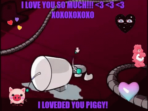 Invader Zim's Gir expresses overwhelming love, declaring 'I Loveded You Piggy!' with hearts and kisses.