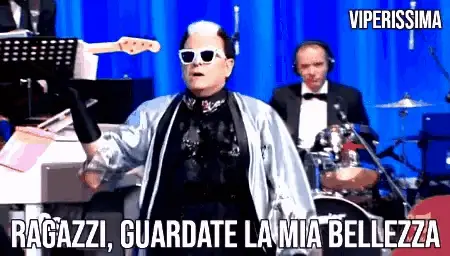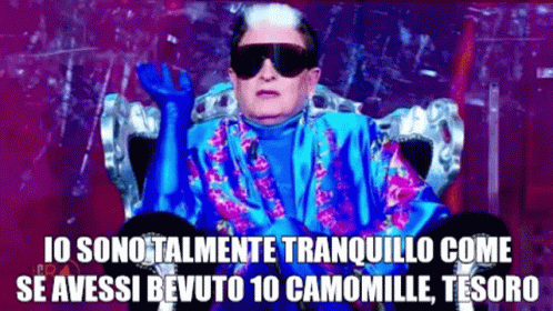 Cristiano Malgioglio, wearing sunglasses and a blue robe, declares he's as calm as if he'd drunk 10 chamomiles.