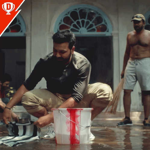 A man squats in a flooded area, wringing a striped cloth into a bucket with red paint, part of an IPL Dream11 advertisement.