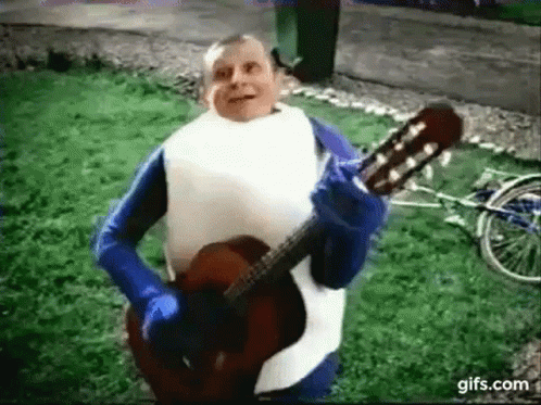 The Ipren Mannen Vark Tabletten character, dressed in a blue and white costume, plays an acoustic guitar.