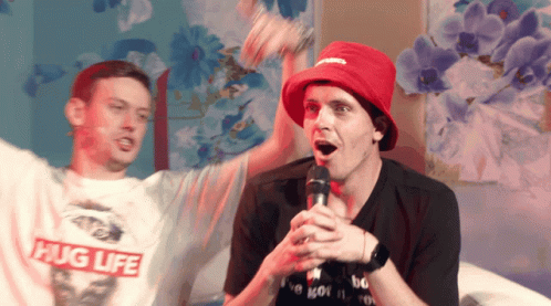 Арсений Попов reacts with surprise and a wide smile while speaking into a microphone.