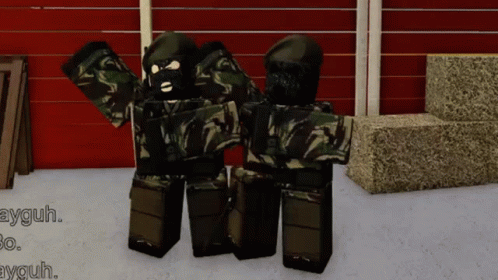 Two Roblox soldiers in camouflage stand against a red wall, part of an Ira Ckc simulation.