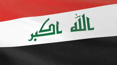 The national flag of Iraq, featuring red, white, and black stripes with green Arabic script, waves proudly.