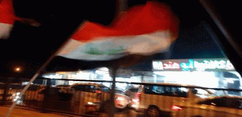 Iraqis wave flags on a busy street in Baghdad at night, with city lights and traffic visible.