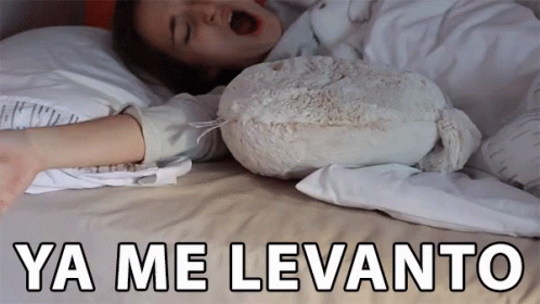 Irene Rain struggles to wake up, yawning and trying to get out of bed with her plush toy.