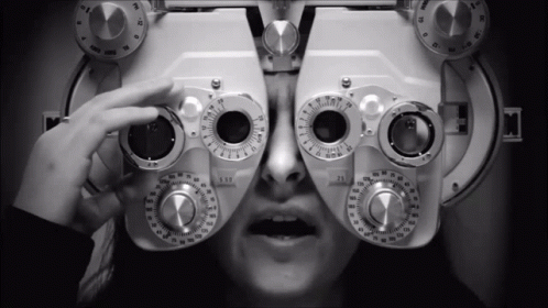 Irma Agiashvili undergoes an eye exam, adjusting a phoropter during the vision test.