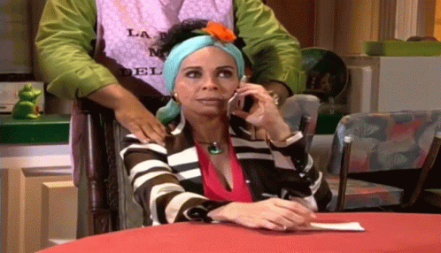 Doña Magda, looking stressed and irritated, talks on the phone while a man stands behind her.