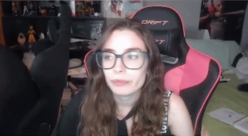 Lyna, wearing glasses and sitting in a pink gaming chair, looks stressed and annoyed, doing a facepalm.