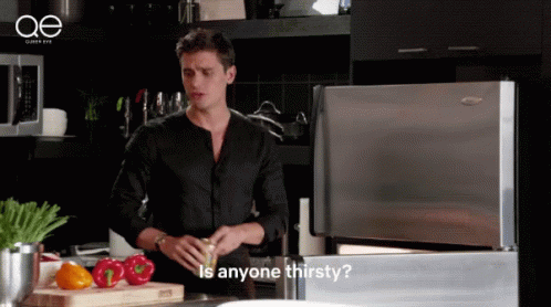 Antoni Porowski from Queer Eye asks if anyone is thirsty while holding a can in a modern kitchen setting.