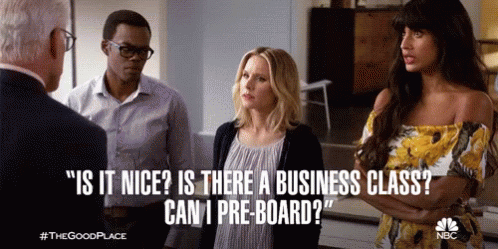 Tahani Al-Jamil (Jameela Jamil) demands to know if there's business class and pre-boarding in The Good Place.