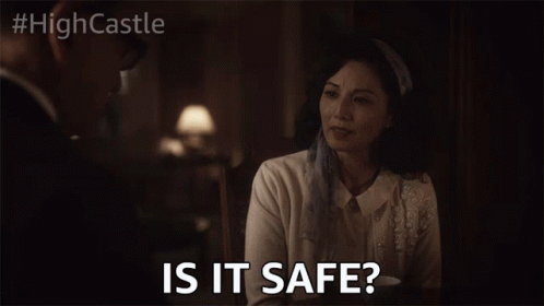 A woman asks 'Is it safe?' with a concerned expression in a tense scene from The Man In The High Castle.