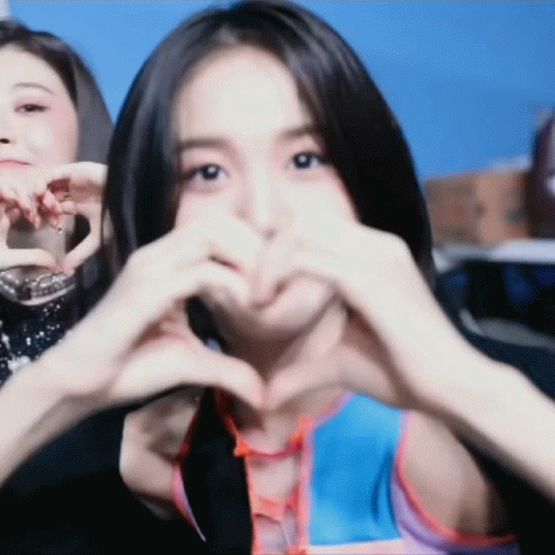 Stayc J smiling and making a heart shape with her hands, showing affection and cuteness.