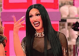 A drag queen with long black hair makes an exaggerated "I see you, I got you" expression.