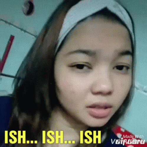 A girl with a headband makes a funny face, says 'Ish... Ish... Ish', and nods her head repeatedly.