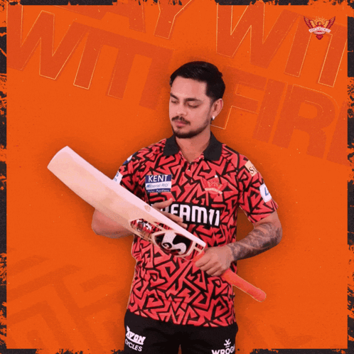 Ishan Kishan, a Sunrisers Hyderabad player, poses with his cricket bat against an orange background.