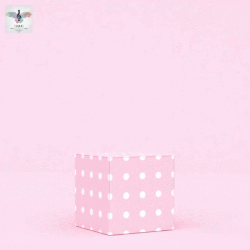A pink polka-dotted box opens, releasing beautiful pink and rose gold hearts, with the text "Me encanta".