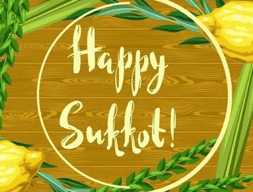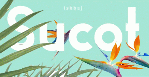 Animated graphic for Ishbaj Sucot featuring large white text, green leaves, and vibrant Bird of Paradise flowers on a light blue background.