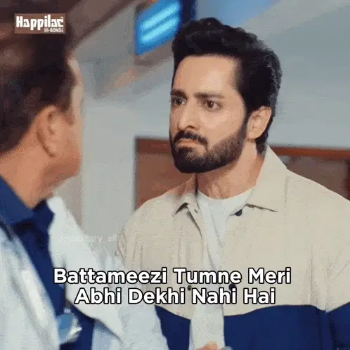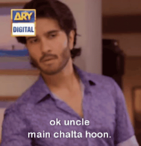 Feroze Khan in a purple shirt says 'ok uncle main chalta hoon' in a scene from the drama Ishqiya.