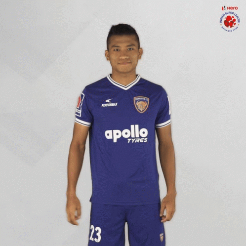 Chennaiyin FC player Remi salutes and waves in his blue jersey with Apollo Tyres logo and number 23.