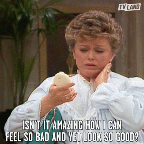 Blanche Devereaux from Golden Girls, played by Rue McClanahan, looks in a mirror and says, 'Isn't it amazing how I can feel so bad and yet look so good?'