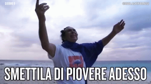 Giucas Casella on Isola dei Famosi, arms raised, pleading for the rain to stop on the beach.