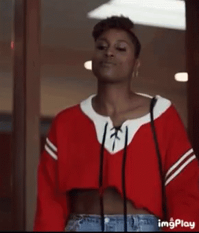 Issa from Insecure shows off her cool dance moves in a red crop top and blue jeans.