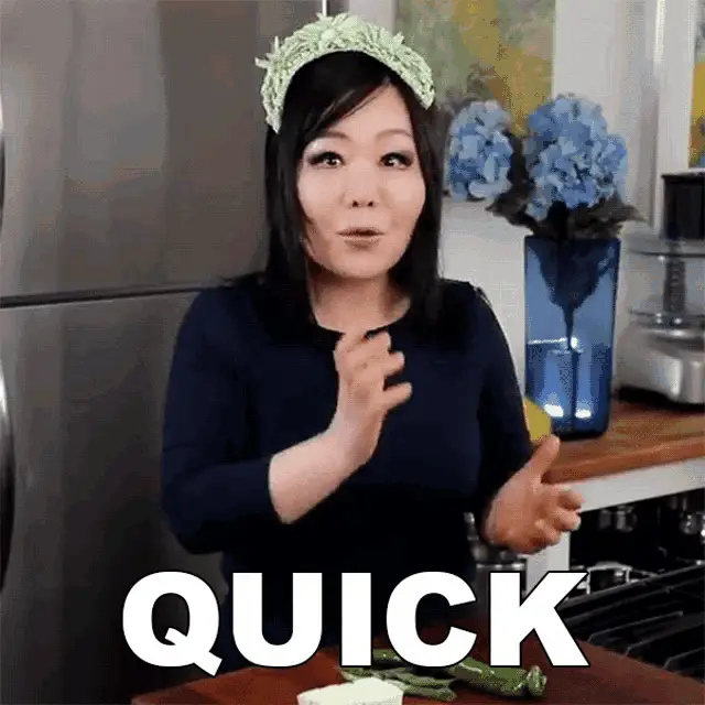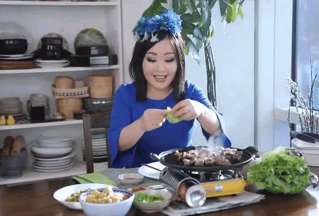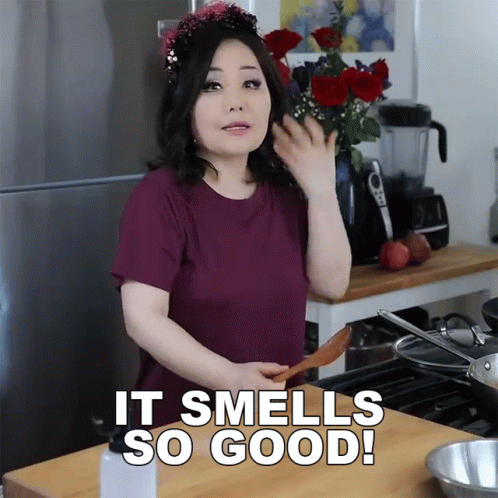 Emily Kim, in her kitchen, reacts with delight to a delicious aroma, exclaiming 'It Smells So Good!'