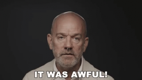 Michael Stipe, known from R.E.M., emphatically states 'It was awful!' with a serious expression.