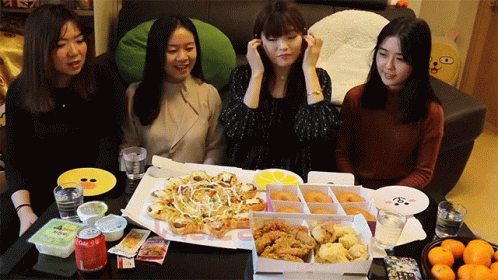 Togimochi and friends gather for a feast, saying 'Itadakimasu' before enjoying pizza, donuts, and fried chicken.