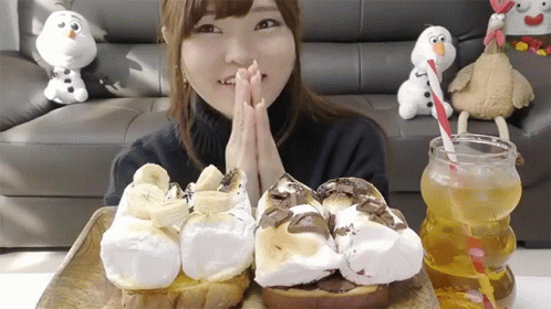 Togimochi smiles, hands clasped, ready to enjoy a delicious feast of marshmallow smores and a drink.