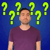 A man performs a classic Italian 'What do you want?' gesture against a blue background with green question marks.