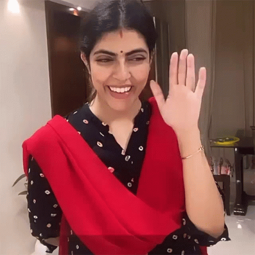 Rj Karishma smiles and waves warmly at the camera, wearing a black patterned shirt and a vibrant red dupatta.