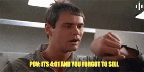 Jim Carrey as Lloyd Christmas from Dumb and Dumber looking shocked, realizing he forgot to sell stocks after hours.