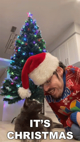 Ricky Berwick, wearing a Santa hat and Christmas sweater, celebrates Christmas with his cat by a festive tree.