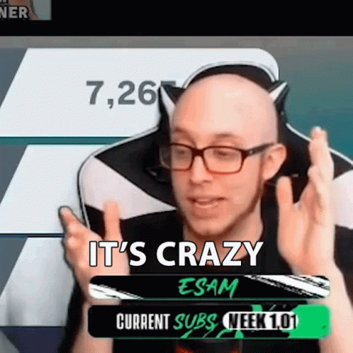 Esam, a bald man with glasses, exclaims 'It's Crazy' while showing his current subscriber count and week 1.01 stats.