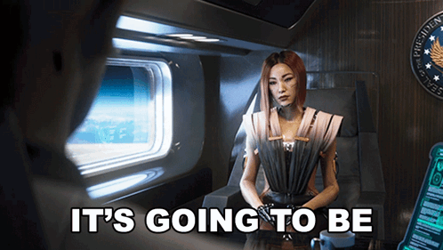 A character from Cyberpunk 2077 Phantom Liberty states, 'It's going to be a long flight!' in a futuristic setting.