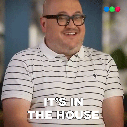 Rodolfo, a bald man in glasses and a striped shirt, enthusiastically declares 'It's in the house!'