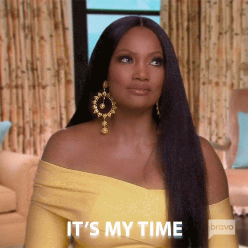 Garcelle Beauvais declares "It's my time" with confidence, wearing a stylish yellow top and large gold earrings.