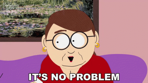 Diane Choksondik from South Park reassures with 'It's No Problem' while sitting on a purple couch.