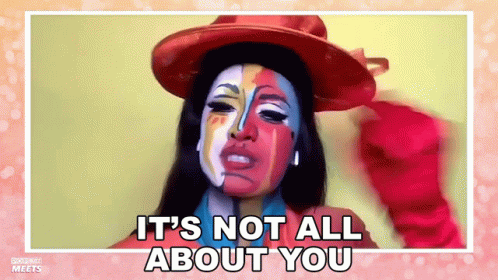 Kyne, with abstract face paint, delivers the message 'It's Not All About You' with a direct expression.