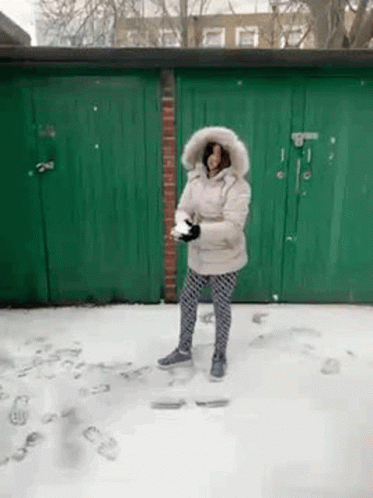 A woman enjoys a snowy day, picking up snow and throwing a snowball in front of green garage doors.