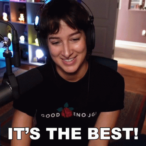 Alli Speed excitedly exclaims 'It's The Best!' while wearing headphones and a 'Good Enough' t-shirt.